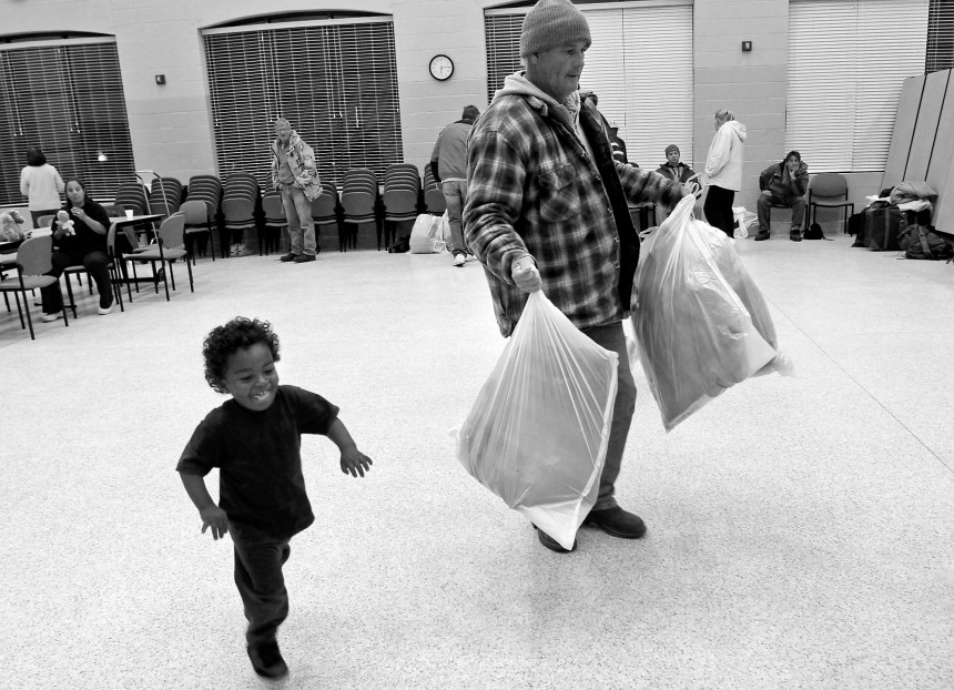 Sidney helps his father as they organize their belongings at a cold weather shelter at the Donal Snyder Community Center.